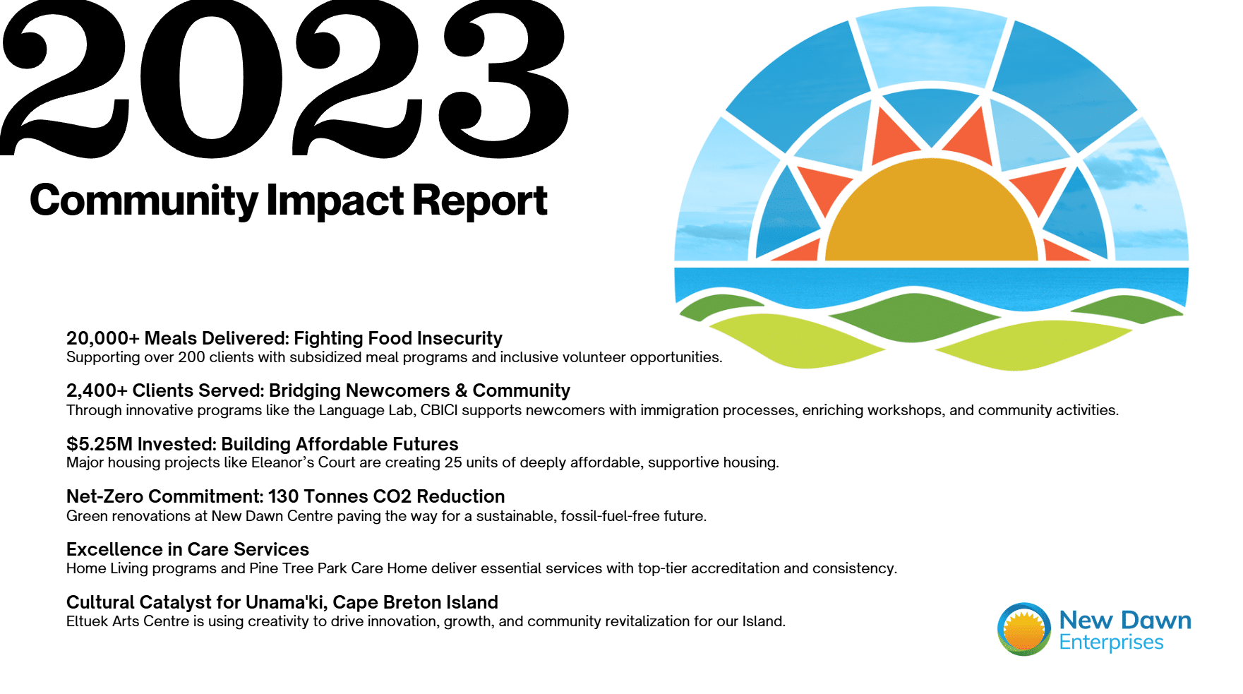 Every day at New Dawn, we engage the community to meet the needs of today and imagine new possibilities for tomorrow. Whether it’s a warm meal for a senior, a safe place for a youth to call home, or a studio where artists and entrepreneurs can dream and build — your support makes it possible. It’s a shared investment in the kind of Cape Breton we all want to call home. With your help, we can do more