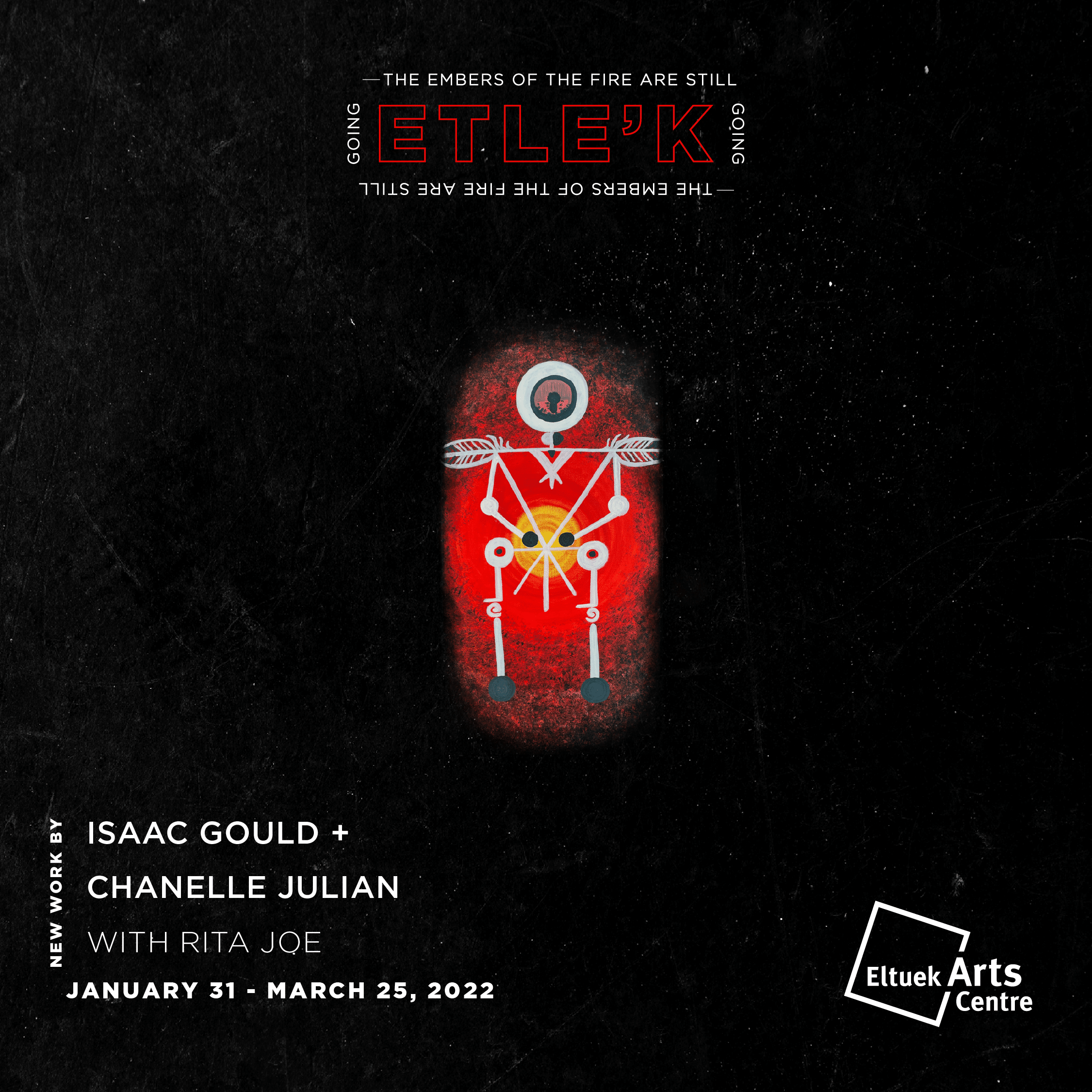 In late October, on the eve of the Eltuek Naming Ceremony, three artists joined us as interns in residence at Eltuek from Eskasoni First Nation. Now in this new year, we are sharing with you the work of artists Isaac Gould and Chanelle Julian, the great-grandchild of poet Rita Joe, in a special exhibition in Eltuek’s main gallery called, ETLE’K – The Embers of the Fire are Still Going.