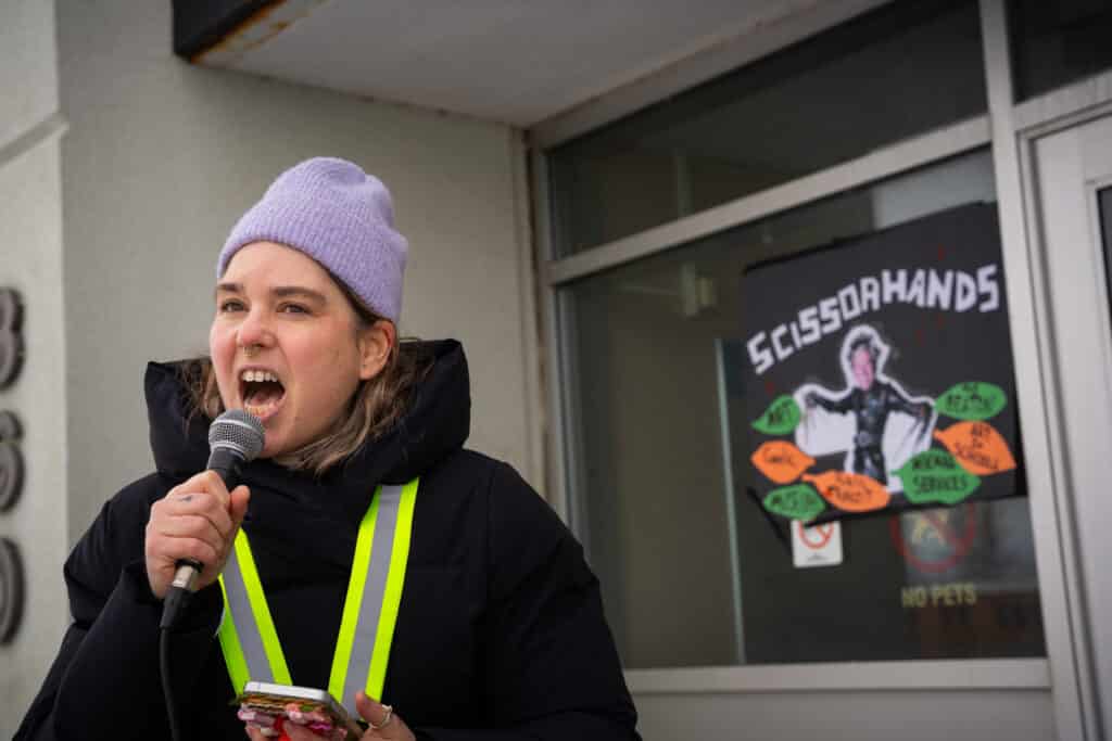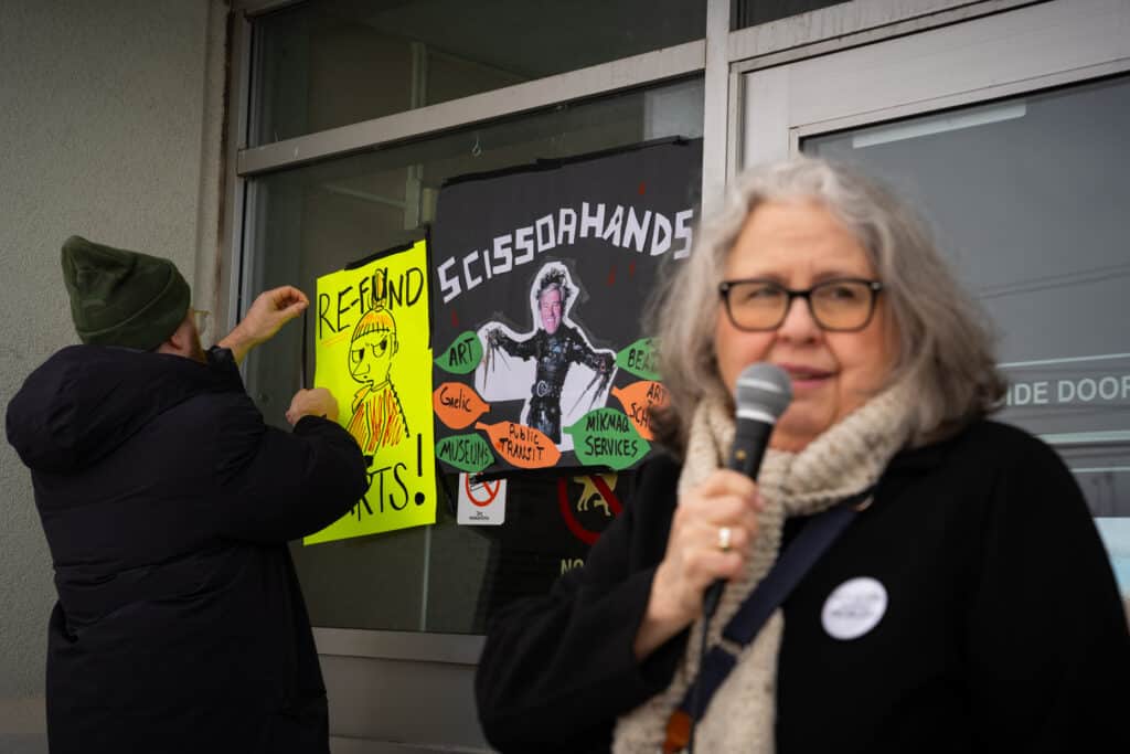 Mel Kearney, an artist and Eltuek Arts Centre’s Curator, led a rally on Wednesday afternoon to protest widespread budget cuts that reduce or eliminate almost 300 operational grants for community organizations and programs.